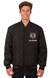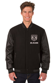 Show your Ram pride with the Ram Reversible Wool and Leather Jacket in black. This premium jacket features a wool-blend body paired with genuine leather sleeves for a bold, classic look. The reversible design includes a sleek nylon lining, giving you two styles in one. Embroidered appliqué Ram patches are displayed on the front of both sides, delivering authentic detail with a subtle yet powerful statement.