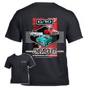 Upgrade your wardrobe with our officially licensed Chevrolet C-10 truck t-shirt, crafted from premium black 100% cotton. This stylish tee showcases the iconic C-10 design, making it a must-have for any classic truck enthusiast. Show off your love for Chevrolet with this high-quality, comfortable shirt, perfect for any casual occasion."