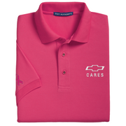 Made from a silk-touch cotton blend, this polo provides a luxuriously soft feel with superior wrinkle and shrink resistance, ensuring durability and comfort that lasts. The design features a subtle embroidered pink ribbon on the chest, offering a professional yet meaningful way to raise awareness.