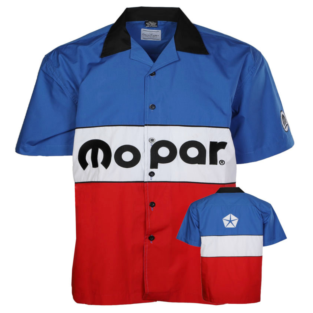 Show off your Mopar pride with this rugged Red White & Blue pit shirt, featuring a Mopar 1972 logo. Designed for durability, this heavy-duty shirt is made from a resilient 65% polyester and 35% cotton blend. Equipped with left and right chest pockets for added functionality, this shirt is officially licensed by Dodge, ensuring authenticity and quality.