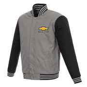 Show your Chevy pride with the Chevy Poly-Twill Jacket in black and grey. Crafted from durable 100% poly-twill, this jacket features a quilted nylon lining for warmth and comfort. Embroidered appliqué Chevy logos are displayed on the front and back, adding bold, authentic detail.
