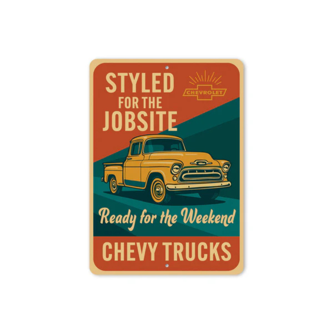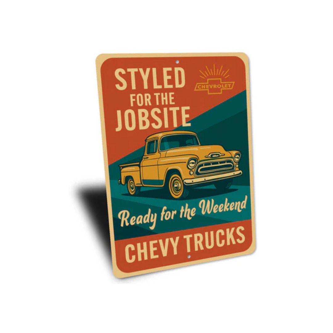 This Chevy Truck Styled For Jobsite Ready For The Weekend Sign makes a great gift!