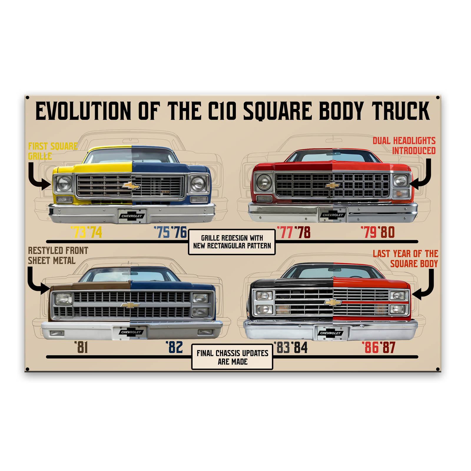 Celebrate the iconic Chevrolet C10 Truck with this premium USA‑made 18 x 12 inch steel wall décor, showcasing the evolution of the Square Body front‑end designs from 1973–1987. Crafted from heavy‑duty steel and printed with vibrant, high‑definition artwork, this piece is perfect for adding classic automotive style to any indoor space. Pre‑drilled pin holes make hanging fast and effortless, making it ideal for garages, man caves, workshops, offices, and more.