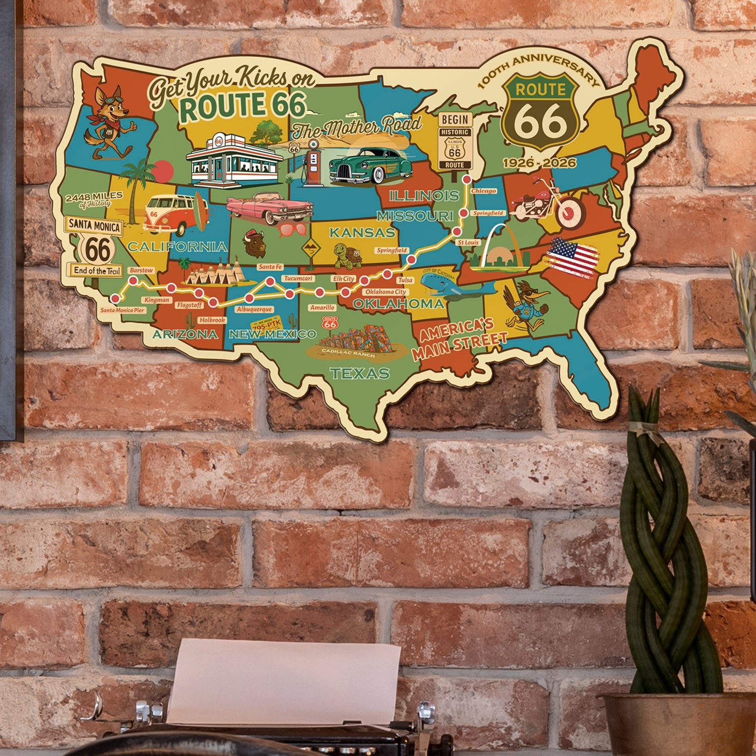 Legends of Route 66 USA Destination Map, 22 Gauge Metal Die Cut Wall Decor 100th Anniversary Edition-Made in the USA