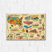 - Vibrant map artwork with key Route 66 destinations