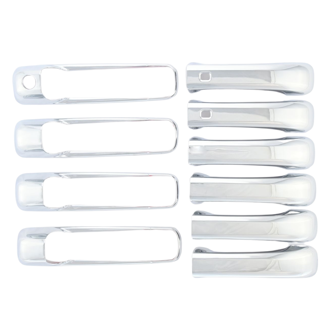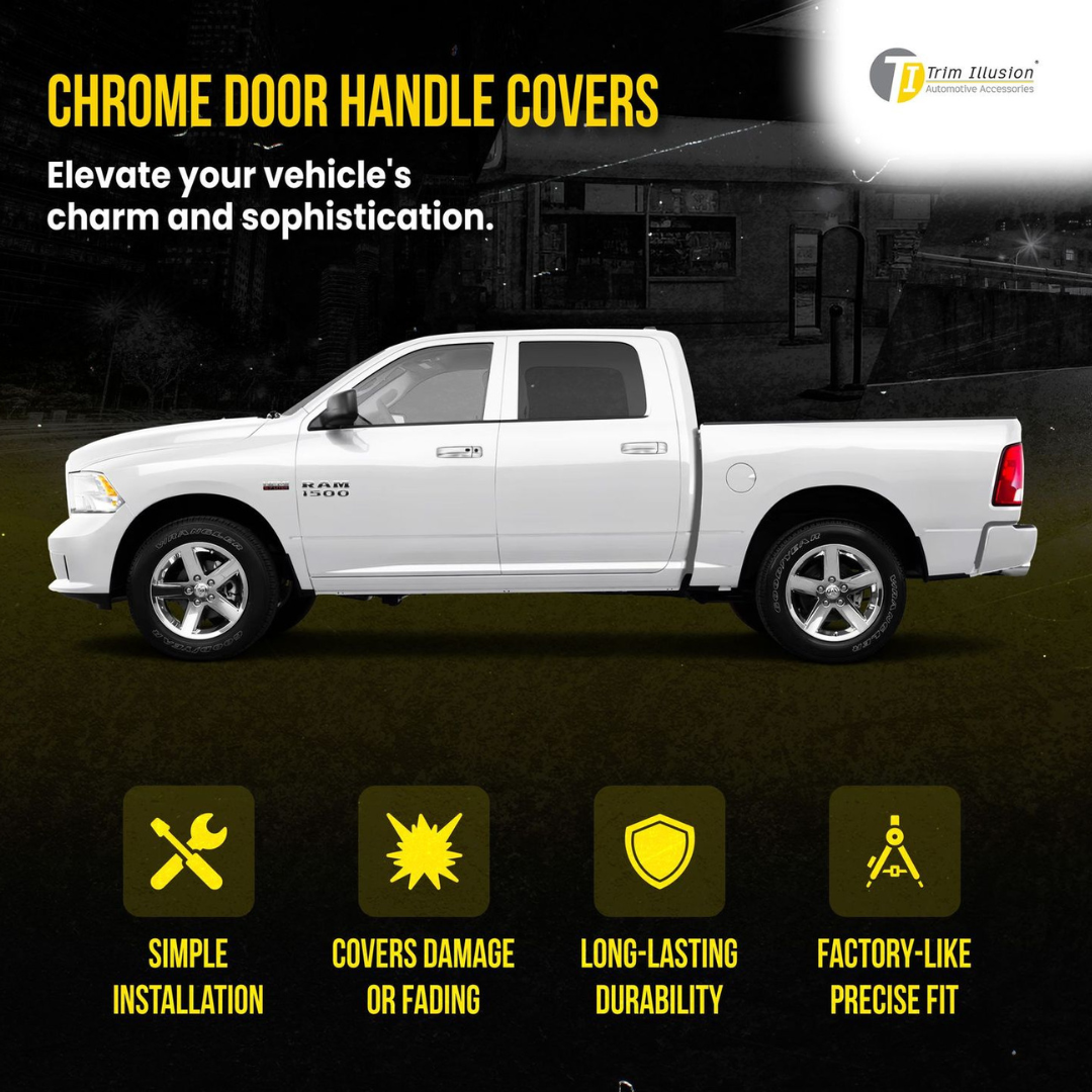 Upgrade your Ram's style with our 10-piece Chrome Snap-On Door Handle Covers, crafted for 2013-2018 Ram 1500/2500/3500 models and 2019-2023 Ram 1500 Classic models, compatible with or without Smart Key. These door handle covers feature a patented snap-on design with adhesive backing, making installation quick and tool-free. The brilliant chrome finish adds a sleek, high-end touch to your Ram, enhancing its look for any road or worksite. Built for durability and style, these covers provide a premium, polished accent to elevate your truck’s exterior appeal.