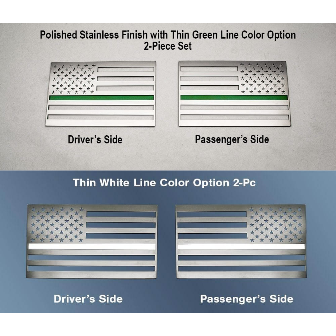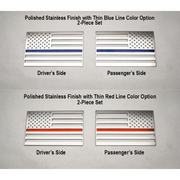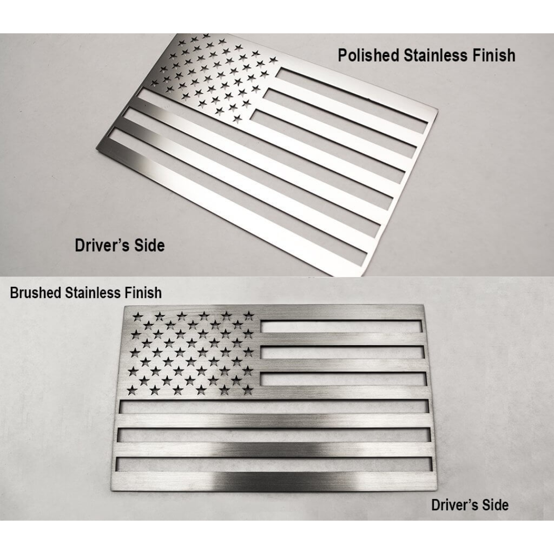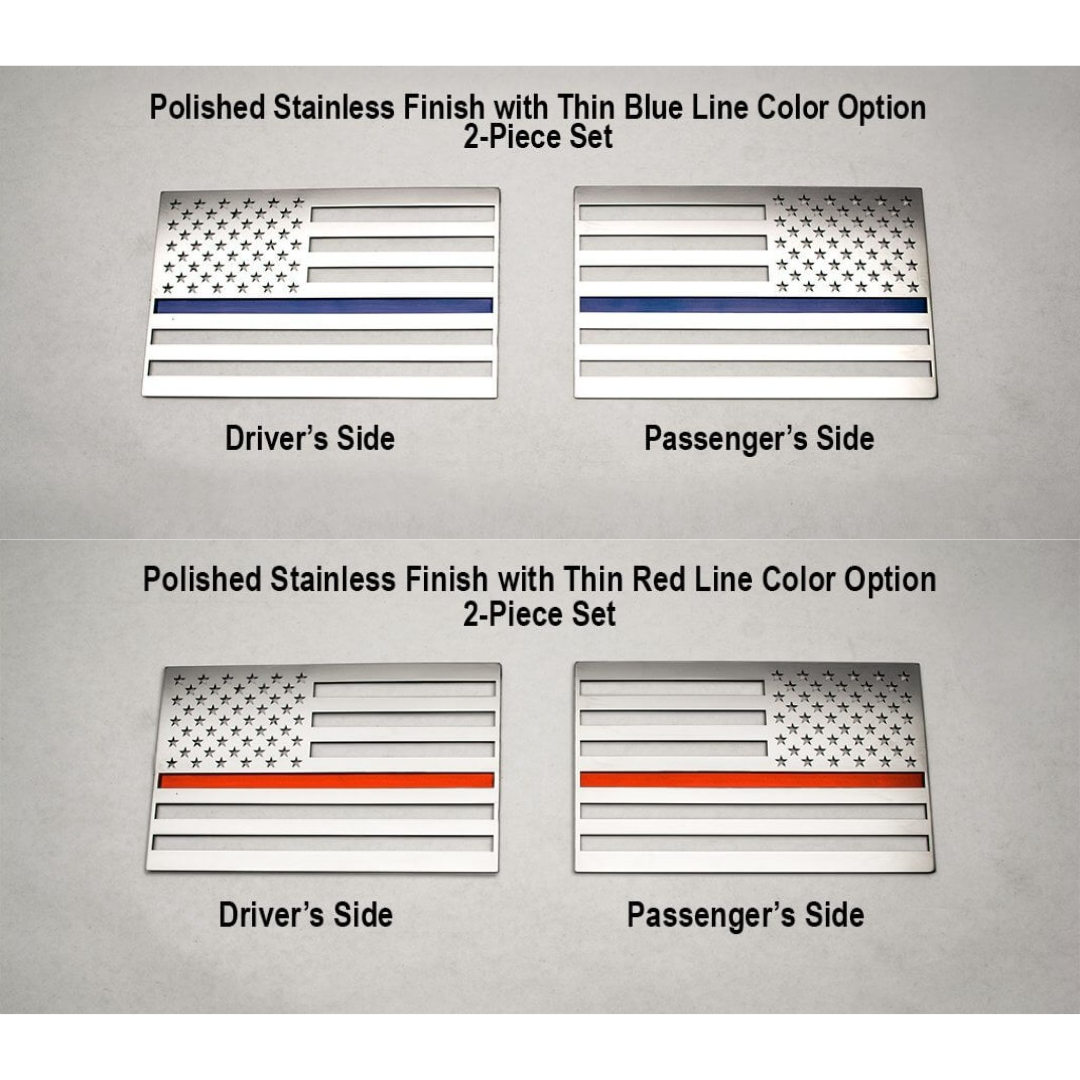 Equip any Jeep or truck (Chevy, Dodge, Ford, GMC, etc.) with our custom American Flag Emblem and show your American patriotism. This stainless steel American Flag Emblem is available in 2 finish options, brushed or polished, and 3 Thin-Line Color Inlay options designed to represent and honor service-based professionals. Also available without the color inlay.